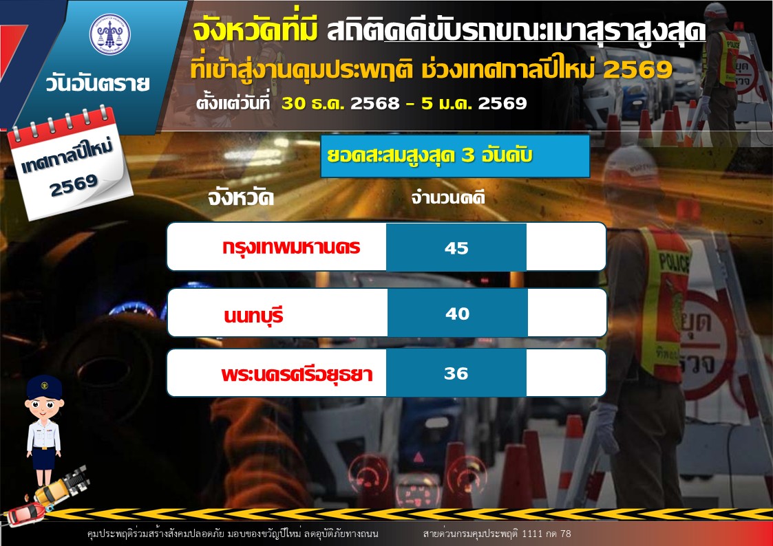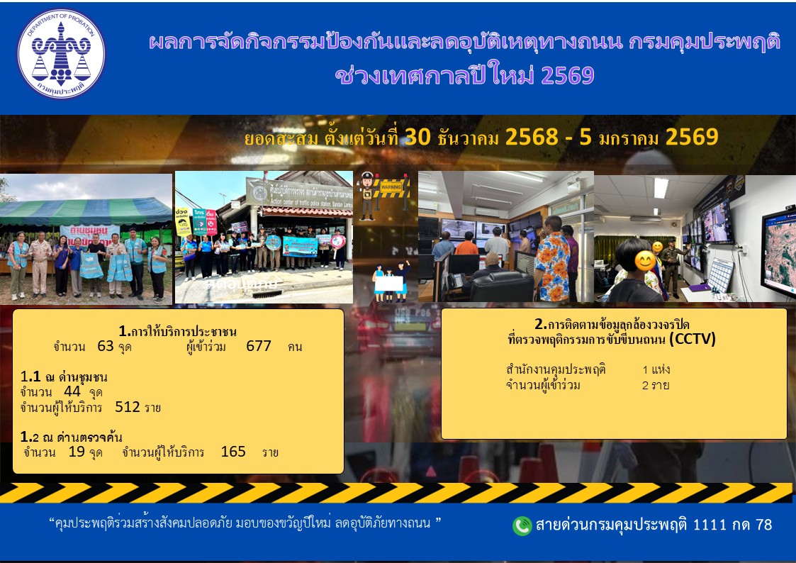 วันนี้ (31 ธันวาคม 2568) ร้อยตำรวจเอก ปิยะ รักสกุล อธิบดีกรมคุมประพฤติ เปิดเผยสถิติคดีที่ศาลสั่งคุมความประพฤติในวันแรก (วันที่ 30 ธันวาคม 2568) ของการรณรงค์ป้องกันและลดอุบัติเหตุทางถนนช่วงเทศกาลปีใหม่ 2569 พบว่ามีคดีเข้าสู่กระบวนการคุมความประพฤติรวมทั้งสิ้น 321 คดี แบ่งเป็น คดีขับรถในขณะเมาสุรา 273 คดี คิดเป็นร้อยละ 85.05 คดีขับรถประมาท 4 คดี คิดเป็นร้อยละ 1.25 และคดีขับเสพ 44 คดี คิดเป็นร้อยละ 13.70 เมื่อเปรียบเทียบคดีขับรถขณะเมาสุราในช่วงเทศกาลปีใหม่ 2569 ซึ่งมีจำนวน 273 คดี กับช่วงปีใหม่ 2568 ที่มีจำนวน 344 คดี พบว่าลดลง 71 คดี โดยจังหวัดที่มีสถิติคดีขับรถขณะเมาสุราสูงสุด 3 อันดับแรก ได้แก่ กรุงเทพมหานคร 45 คดี จังหวัดนนทบุรี 40 คดี และจังหวัดพระนครศรีอยุธยา 36 คดี อธิบดีกรมคุมประพฤติกล่าวแสดงความห่วงใยต่อพี่น้องประชาชนที่เดินทางกลับภูมิลำเนาและท่องเที่ยวในช่วงวันหยุดยาวเทศกาลปีใหม่ โดยกรมคุมประพฤติได้เตรียมแผนดำเนินงานรองรับช่วงเทศกาลปีใหม่ 2569 ภายใต้แนวคิด "คุมประพฤติห่วงใย ร่วมสร้างสังคมปลอดภัย ลดอุบัติภัยทางถนน" ผ่าน 4 มาตรการสำคัญ ได้แก่ 1.มาตรการด้านการบริหารจัดการ 2.มาตรการด้านการลดปัจจัยเสี่ยงด้านถนนและสภาพแวดล้อม 3.มาตรการด้านผู้ใช้รถใช้ถนนอย่างปลอดภัย 4.มาตรการด้านการช่วยเหลือหลังเกิดอุบัติเหตุ นอกจากนี้ สำนักงานคุมประพฤติทั่วประเทศยังได้จัดกิจกรรมรณรงค์และสนับสนุนความปลอดภัยทางถนนอย่างต่อเนื่อง อาทิ การรณรงค์ประชาสัมพันธ์สร้างความตระหนักด้านการขับขี่ปลอดภัยแ จำนวน 9 ครั้ง มีผู้เข้าร่วม 586 ราย และการสนับสนุนการปฏิบัติงาน ณ ด่านชุมชนและด่านตรวจค้น จำนวน 63 จุด มีผู้เข้าร่วม 677 ราย อธิบดีกรมคุมประพฤติกล่าวทิ้งท้ายว่า "ความปลอดภัยบนท้องถนนเป็นเรื่องที่ทุกคนต้องร่วมมือกัน กรมคุมประพฤติขอเชิญชวนประชาชนปฏิบัติตามกฎจราจร ลดพฤติกรรมเสี่ยง เพื่อให้เทศกาลปีใหม่นี้เป็นช่วงเวลาแห่งความสุขและความปลอดภัยสำหรับทุกครอบครัว"
