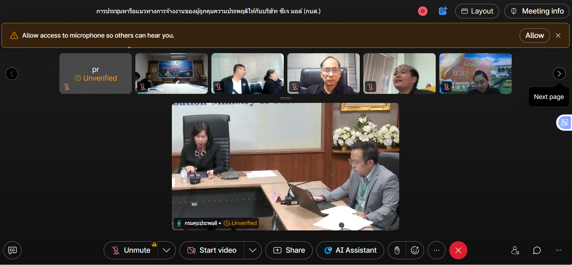 วันนี้ (24 กุมภาพันธ์ 2569) นางยศวันต์ บริบูรณ์ธนา ร่วมประชุมกับนายพีรศุภ อินลี รองผู้จัดการฝ่ายความยั่งยืน สำนักประธานเจ้าหน้าที่บริหาร เพื่อเตรียมความพร้อมการจ้างงานผู้ถูกคุมความประพฤติในบริษัท ซีเจ มอร์ (CJ more) ภายใต้โครงการ "คืนคนดีสู่สังคม" โดยมี ว่าที่ร้อยเอกกนกศักดิ์ แถวทิม ผู้อำนวยการกองบริหารและส่งเสริมเครือข่ายคุมประพฤติ ผู้อำนวยการสำนักงานคุมประพฤติพื้นที่นำร่อง 4 จังหวัด ได้แก่ กรุงเทพมหานคร นนทบุรี สมุทรปราการ และฉะเชิงเทรา พร้อมเจ้าหน้าที่ที่เกี่ยวข้องเข้าร่วมประชุม ณ ห้องประชุมกรมคุมประพฤติ ชั้น 3 อาคารราชบุรีดิเรกฤทธิ์ ศูนย์ราชการเฉลิมพระเกียรติ ถนนแจ้งวัฒนะ กรุงเทพมหานคร และผ่านระบบการประชุมทางไกลผ่านจอภาพ (Video Conference)