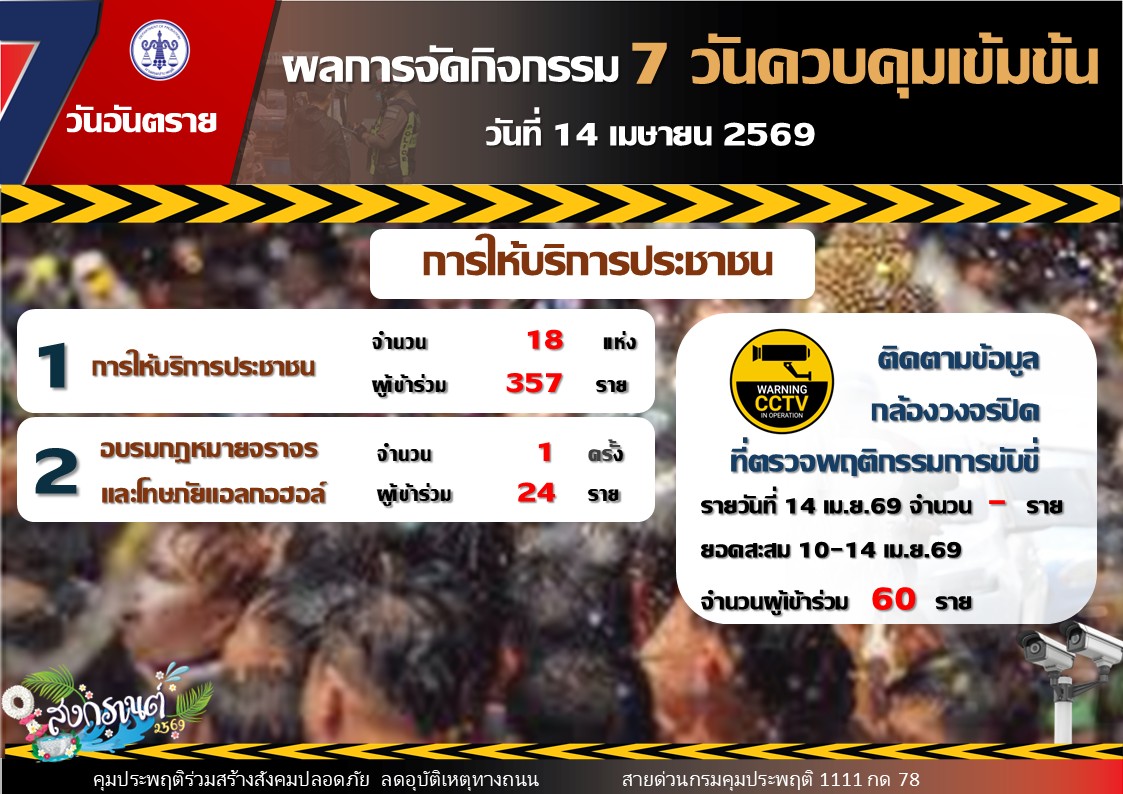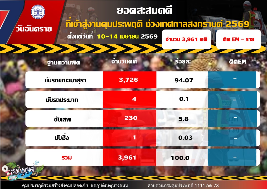 ขณะที่สถิติคดีสะสมช่วง 5 วัน (10 - 14 เมษายน 2569) มีจำนวนรวม 3,961 คดี โดยเป็นคดีขับรถขณะเมาสุรา 3,726 คดี คิดเป็นร้อยละ 94.07 คดีขับเสพ 230 คดี คิดเป็นร้อยละ 5.8 คดีขับรถประมาท 4 คดี คิดเป็นร้อยละ 0.1 และคดีขับซิ่ง 1 คดี คิดเป็นร้อยละ 0.03