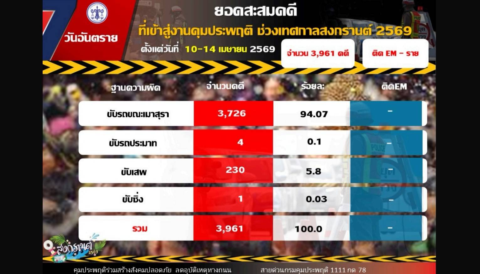 ในช่วง 5 วันแรกของเทศกาล (10-14 เมษายน 2569) มีคดีเข้าสู่กระบวนการคุมประพฤติรวม 3,961 คดี โดยเป็นคดีเมาแล้วขับสูงถึง 3,726 คดี คิดเป็นร้อยละ 94.07 รองลงมาคือคดีขับเสพ 230 คดี สะท้อนพฤติกรรมเสี่ยงที่ยังต้องได้รับการแก้ไขอย่างต่อเนื่อง ทั้งนี้ จังหวัดที่มีคดีเมาแล้วขับสูงสุด ได้แก่ เชียงใหม่ สมุทรปราการ และนนทบุรี