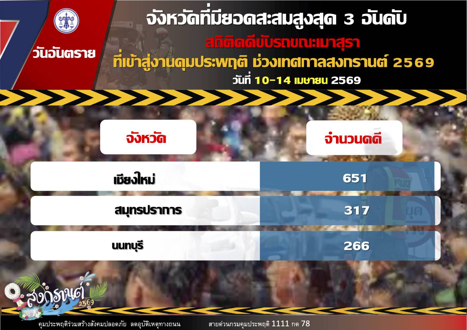 สำหรับอุบัติเหตุทางถนนสะสมในช่วง 5 วันของการรณรงค์ (10 - 14 เม.ย. 69) เกิดอุบัติเหตุรวม 951 ครั้ง ผู้บาดเจ็บ รวม 911 คน ผู้เสียชีวิต รวม 191 ราย จังหวัดที่เกิดอุบัติเหตุสะสมสูงสุดได้แก่ แพร่ (45 ครั้ง) จังหวัดที่มีผู้บาดเจ็บสะสมสูงสุด ได้แก่ แพร่ (47 คน) จังหวัดที่มีผู้เสียชีวิตสะสมสูงสุด ได้แก่ กรุงเทพมหานคร (16 ราย)