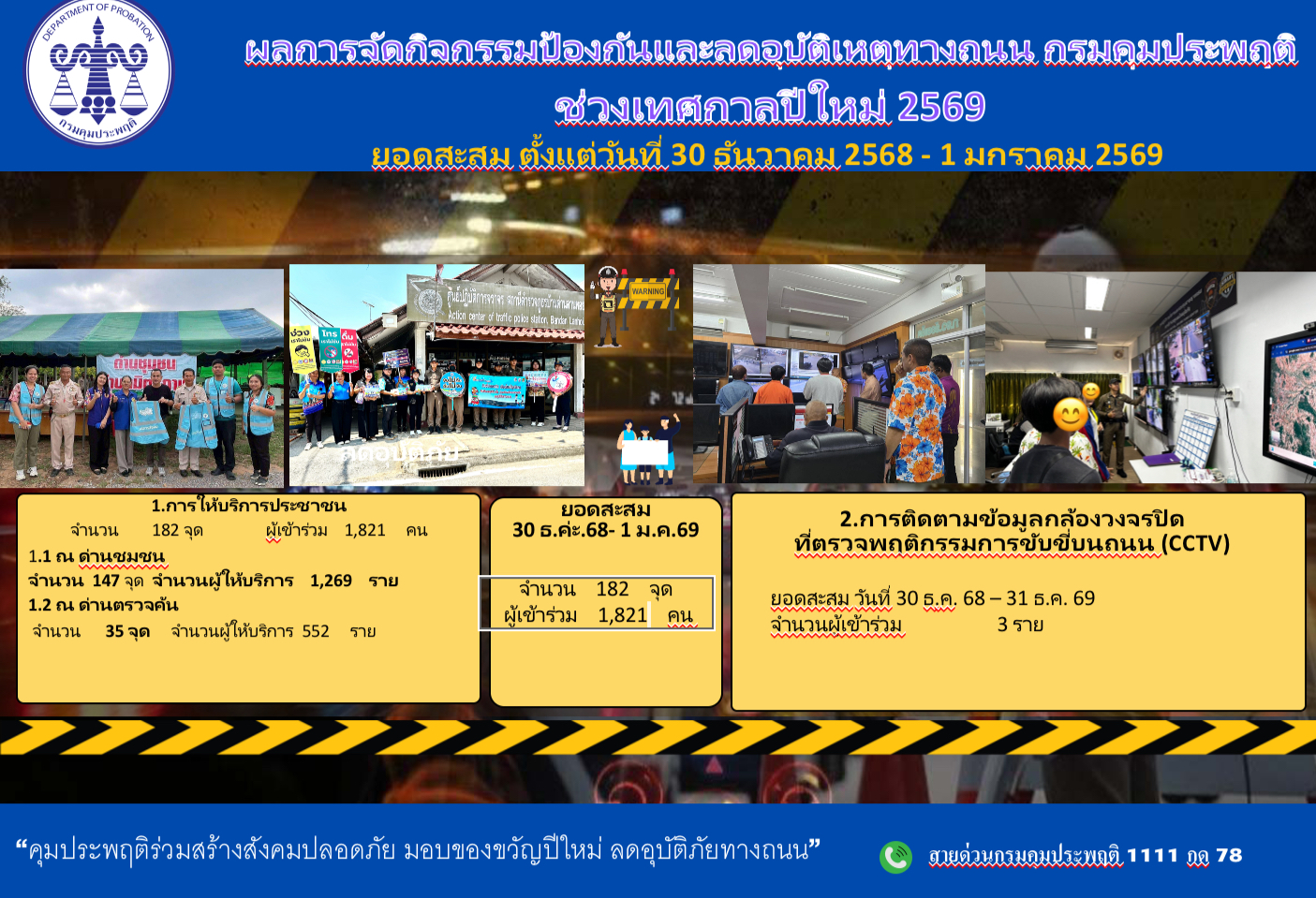 อธิบดีกรมคุมประพฤติ ย้ำมาตรการช่วงควบคุมเข้มข้น ให้สำนักงานคุมประพฤติทั่วประเทศบูรณาการจัดกิจกรรมร่วมกับหน่วยงานที่เกี่ยวข้องและอาสาสมัครคุมประพฤติในพื้นที่ นำผู้ถูกคุมความประพฤติทำงานบริการสังคม ณ หน่วยบริการประชาชน ทั้งในจุดตรวจหลักและด่านชุมชน รวมถึงการทำความสะอาดและปรับภูมิทัศน์บริเวณจุดเสี่ยง จำนวน 28 จุด โดยมีผู้เข้าร่วมกิจกรรมทั้งสิ้น จำนวน 310 ราย เพื่อเป็นการรณรงค์ป้องกันและลดอุบัติเหตุทางถนน