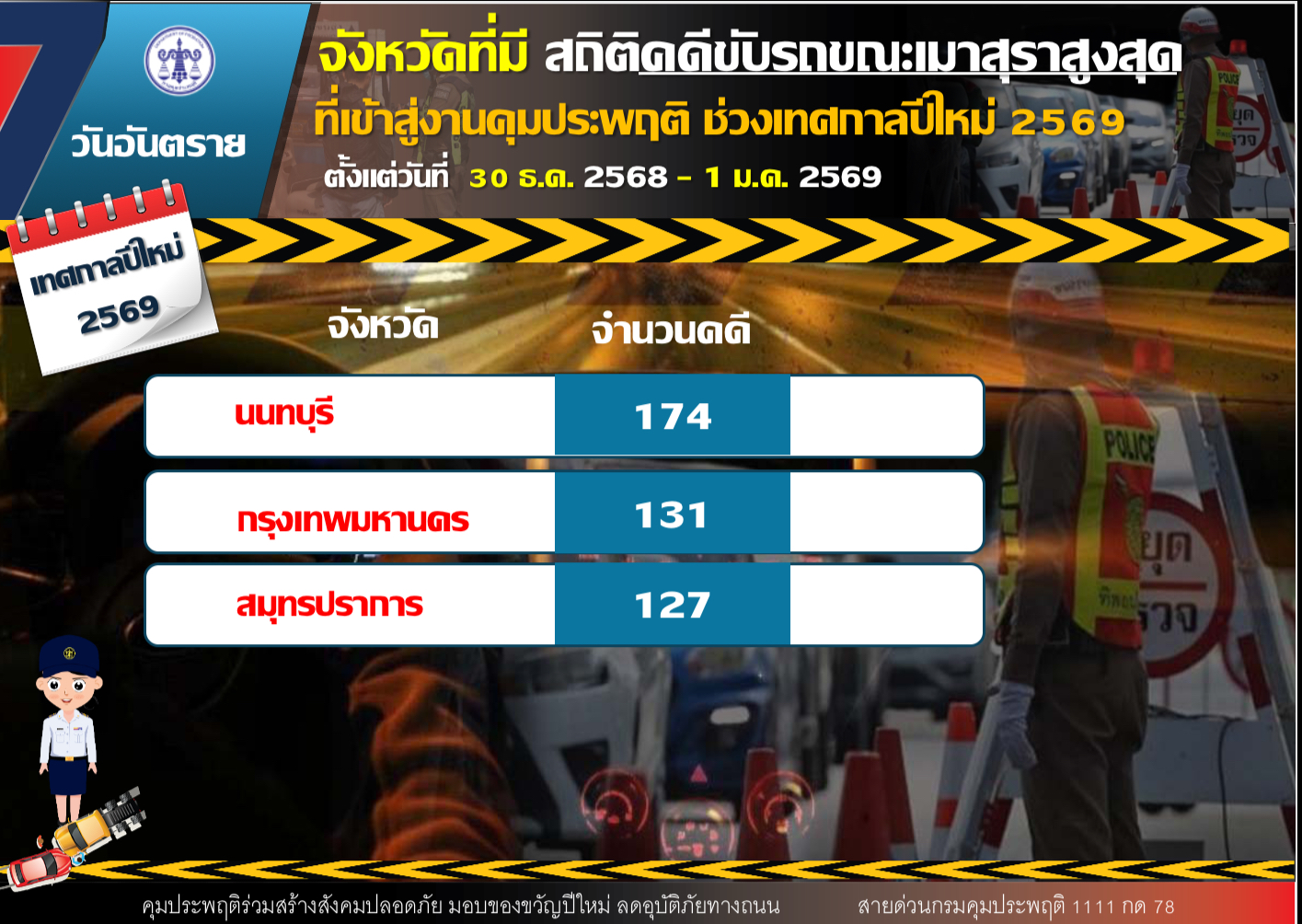 ส่วนจังหวัดที่มีสถิติคดีขับรถขณะเมาสุราสูงสุด 3 อันดับแรก ได้แก่ 1. นนทบุรี จำนวน 174 คดี 2. กรุงเทพมหานคร จำนวน 131 คดี และ สมุทรปราการ จำนวน 127 คดี