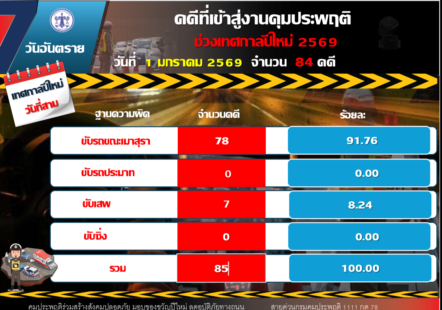 ขณะที่ยอดคดีสะสมตลอด 3 วัน (30 ธันวาคม 2568 - 1 มกราคม 2569) รวมทั้งสิ้น 1,558 คดี แบ่งเป็น
