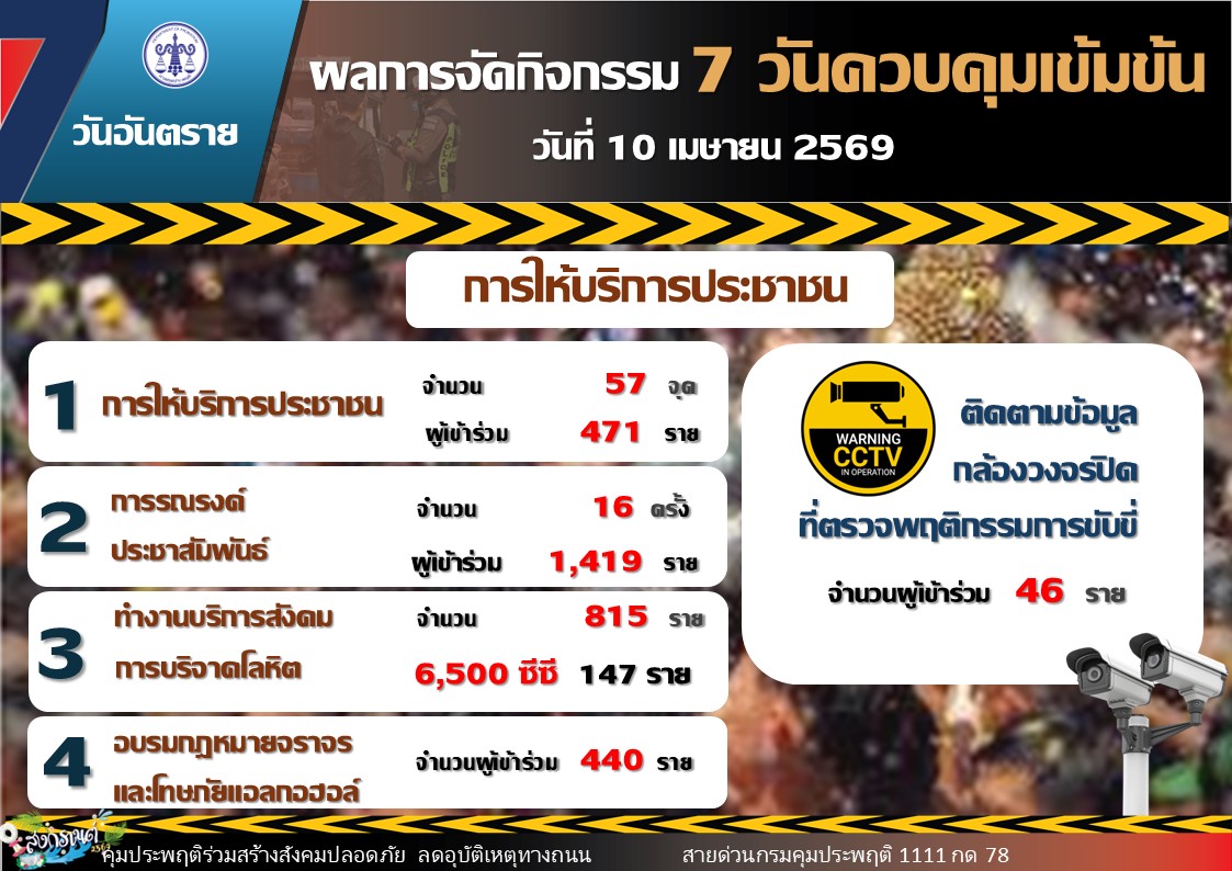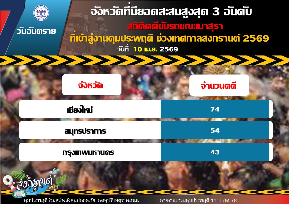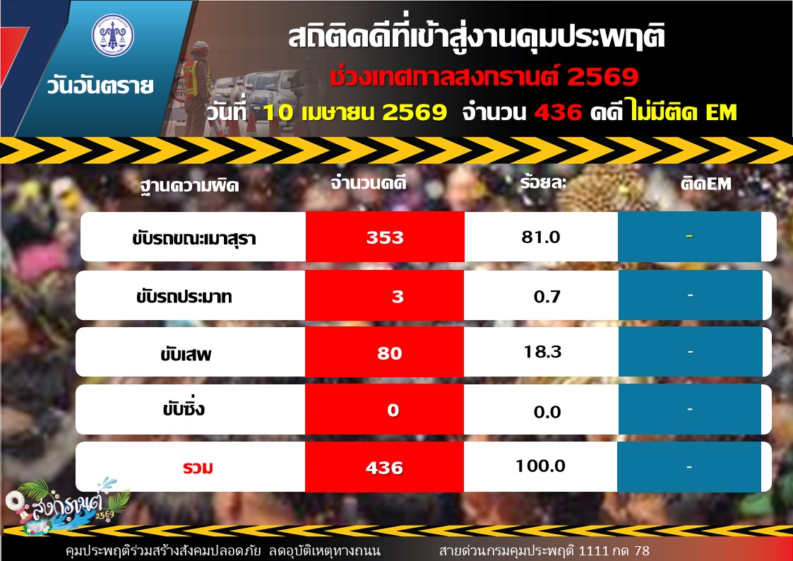 วันนี้ (11 เมษายน 2569) ร้อยตำรวจเอก ปิยะ รักสกุล อธิบดีกรมคุมประพฤติ เปิดเผยสถิติคดีที่ศาลสั่งคุมความประพฤติในวันแรก (วันที่ 10 เมษายน 2569) ของการรณรงค์ป้องกันและลดอุบัติเหตุทางถนนช่วงเทศกาลสงกรานต์ 2569 พบว่ามีคดีเข้าสู่กระบวนการคุมความประพฤติรวมทั้งสิ้น 436 คดี แบ่งเป็น คดีขับรถในขณะเมาสุรา 353 คดี คิดเป็นร้อยละ 81 คดีขับรถประมาท 3 คดี คิดเป็นร้อยละ 0.7 และคดีขับเสพ 80 คดี คิดเป็นร้อยละ 18.3 โดยจังหวัดที่มีสถิติคดีขับรถขณะเมาสุราสูงสุด 3 อันดับแรก ได้แก่ เชียงใหม่ 74 คดี สมุทรปราการ 54 คดี และกรุงเทพมหานคร 43 คดี